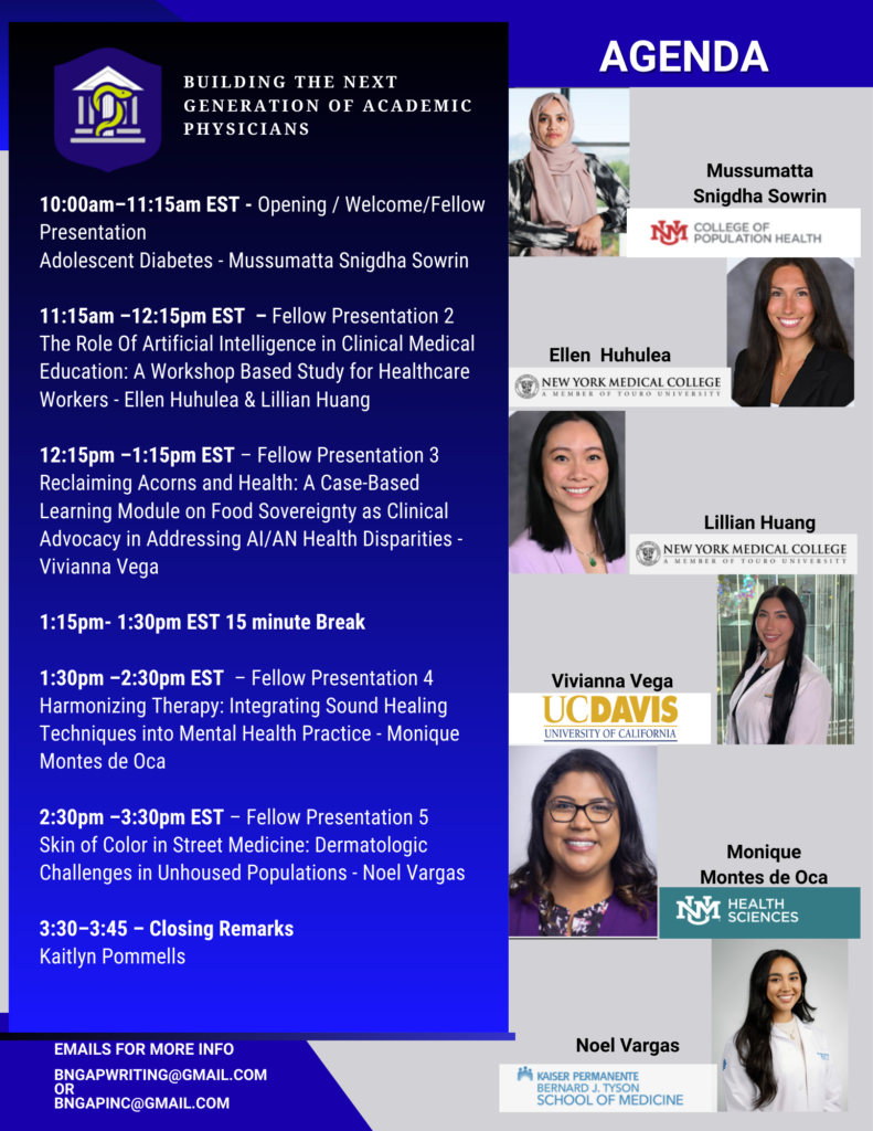 The fifth class of the Academic Medicine Writing Fellowship, BNGAP National Center for Pre-Faculty Development will be showcasing their medical education work. The medical students, residents, and faculty fellows will be providing interactive workshops on a variety of diversity related topics. We hope that you will join us in reviewing their work and encouraging them in transforming their work into a MedEdPORTAL publication. Registration is FREE and we would love your participation.